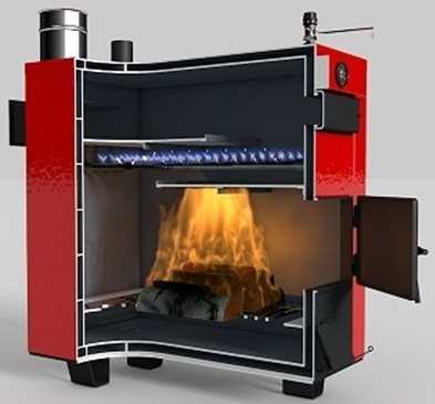 - Ввиду недостатка кислорода происходит обугливание дров, в результате которого выделяется газ, поступающий в другую камеру сгорания посредством специального воздуховода. Здесь происходит смешение поступающего газа с воздухом, при сгорании которых и выделяется большая часть тепла.