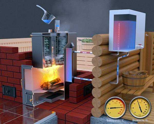 Существует несколько вариантов устройства печи для бани с теплообменником, которые отличаются между собой по материалам производства и методам монтажа. В целом же печи для бани с отопительным контуром можно разделить на две главные категории: с внешним и внутренним типом обменника.