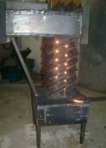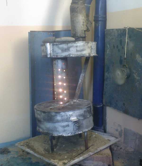 Изготавливают такую жидкотопливную печь следующим образом. Берут листовое железо и варят из него нижнюю часть, которая является топливным баком. Его соединяют трубой, имеющей множество дыр диаметром 10 мм, с верхней камерой, где происходит догорание отработанных газов. Она в свою очередь соединяется с дымоходом, который должен быть строго вертикальным. В топливном баке имеется отверстие, в которое заливают отработку и поджигают ее. Это отверстие закрывают регулируемой заслонкой. С помощью нее контролируют количество поступающего воздуха, а, следовательно, и интенсивность горения. Если есть возможность изготовить такую печь из бочки или газового баллона, то это еще удобней.
