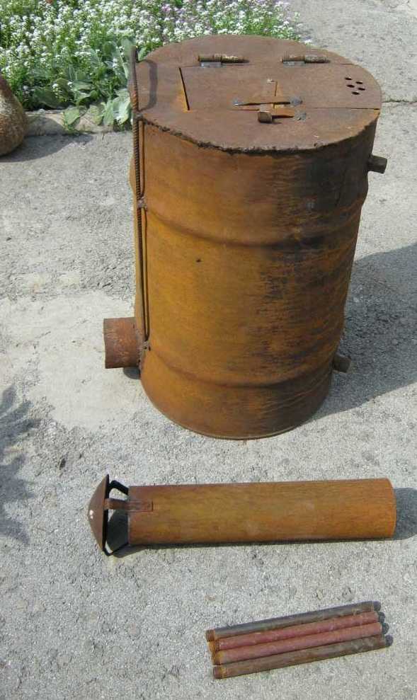 Главной задачей при изготовлении печи длительного горения является создание в ней условий, позволяющих отделять пиролизы и воспламенять их отдельно от дров. Чаще всего для этого берут готовую 200 литровую металлическую бочку. Верх бочки отрезают и делают в нем отверстие, куда будет входить дымоход диаметром не менее 150 мм. Еще одно отверстие прорезают диаметром 100 мм. Туда будет вставлена труба для поступления воздуха. Затем делают тяжелый поршень. Для этого из листового металла вырезают круг чуть меньшего диаметра, чем бочка. В нем прорезают отверстие под трубу подачи воздуха и приваривают эту трубу. Снизу к получившемуся поршню приваривают пару кусков тяжелого швеллера. Поршень вместе с трубой вставляют сверху в бочку и закрывают всю конструкцию крышкой так, чтобы труба для воздуха вышла в приготовленное для нее отверстие. На ней делают еще и заслонку для регулирования потока.