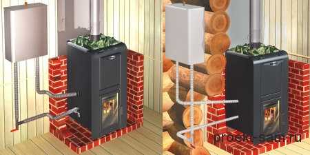 Печь для бани с трубой, проходящей через каменку и водяной бакДымоход