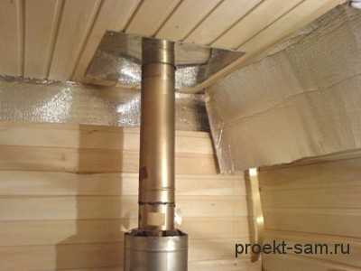 Также на чертеже печи для бани необходимо указать место, где дымоход будет проходить через крышу. Это место необходимо тщательно изолировать, так как воздух, проходящий через трубу очень горячий.