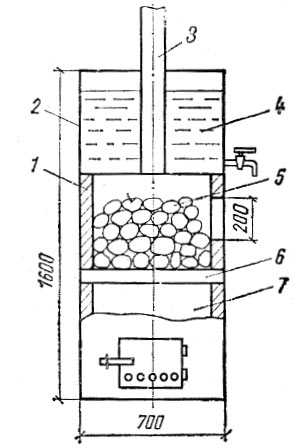 Подробный чертеж печи для бани из металлаБак для воды и место для камней