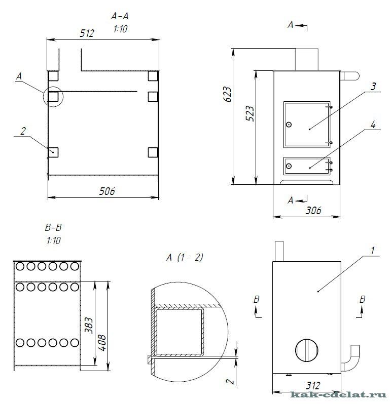 Чертеж буржуйки своими рукамиВладельцы дач и коттеджей достаточно часто прибегают к отоплению гаража при помощи различных самодельных обогревателей.