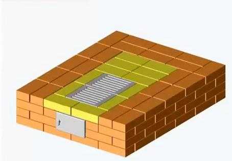 - 4-5 ряды. Формируются вход поддувала и зольная камера, устанавливается решетка колосника, для чего в кирпичах прорезается канавка.