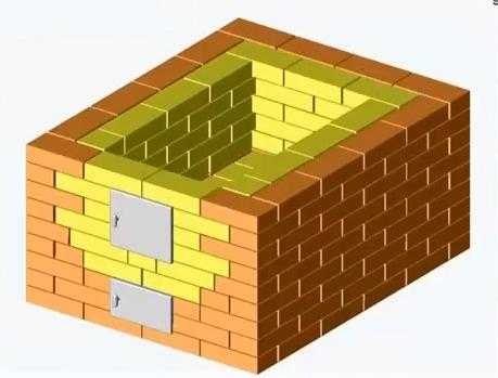 Первые 7 рядов кирпичной кладки формируют шанцы и зону зольной камеры. Первый ряд кирпича ложится на цементно-песчаный раствор, а все последующие — на глинисто-песчаную смесь. Кирпичи в рядах должны быть увязаны. Вертикальный стык в одном ряду должен приходиться на середину кирпича в предыдущем и последующем рядах. Порядок укладки кирпичей следующий: