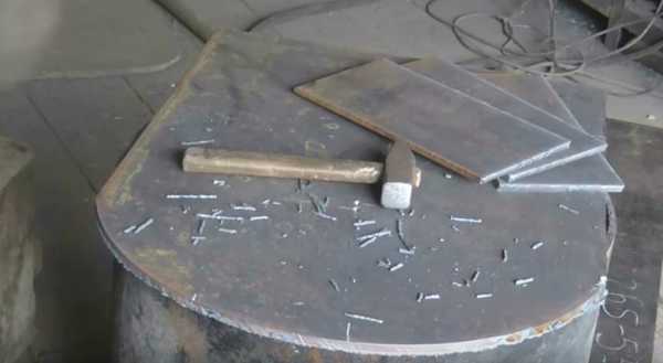 После того как вырезаны все отдельные элементы печи, наиболее нагревающиеся детали предварительно отпустите. Сильнее всего греются боковые и верхние части и дверка топки. Нагрейте их любым способом до красного цвета и медленно охлаждайте. После отпуска листы могут немного покоробиться, это не страшно, молотком подровняйте их до первоначального состояния. Еще раз проверьте размеры, если они изменились в заметных пределах, отрежьте до нужных параметров. Этот простой способ исключит коробление печки во время ее эксплуатации.
