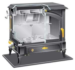 Более высокий КПД имеют печные агрегаты длительного горения. Для увеличения теплоотдачи их оснащают камерой, в которых дожигают пиролизные газы (горючие газы, образующие при тлении древесины). Регулировка подачи воздуха в эту камеру производится отдельно.