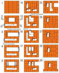 - Согласно схеме укладываются все последующие ряды кирпича. Параллельно с этим устанавливаются дверцы в обозначенных местах.