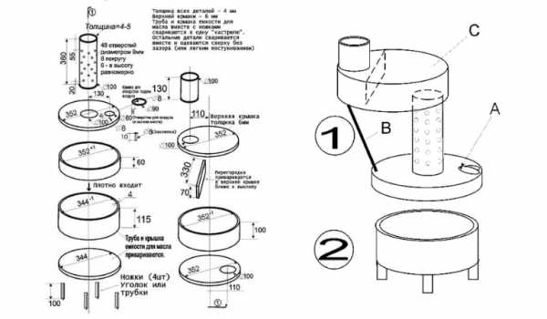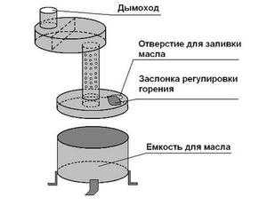 Конструкция буржуйки, работающей на отработанном маслеИз плотного листа стали необходимо сделать устойчивые ножки. Их следует приварить к нижнему контейнеру. Нижний бак будет использоваться для отработанного масла, поэтому стоит сделать его более крупных размеров, чем верхний. Сверху контейнера следует сделать небольшое отверстие для заливки топлива и розжига смеси. Обязательно сконструируйте заслонку, так как при использовании отработанного масла и процессе горения нижний бак должен быть полностью герметичным.