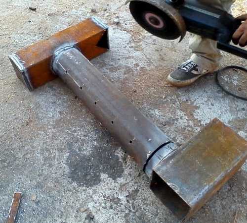 - С обратной стороны от отверстия приваривается труба. Ее диаметр – 10 сантиметров. Толщина трубы должна быть не менее 4 миллиметров. Данная труба будет служить для отвода дыма.