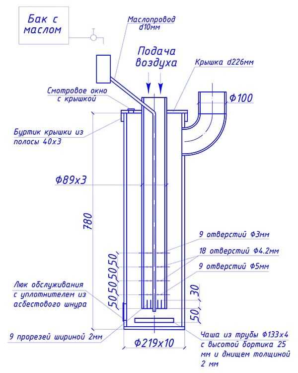 При самостоятельном создании печи на отработанном масле, воспользуемся следующими проверенными чертежами и схемами: