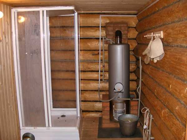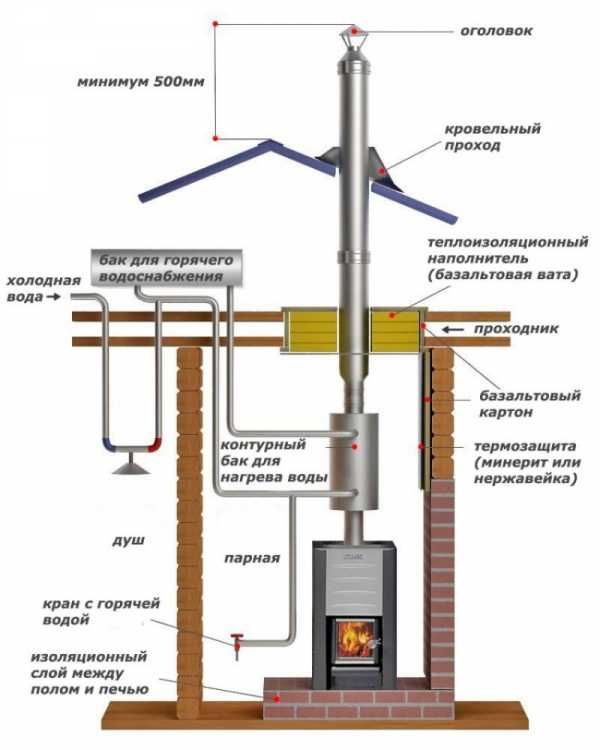 Оптимальных мест установки бака в помещениях внутри дома только два. Это край чугунной печной плиты, ближе к дымоходу или установка в месте перехода продуктов горения из печи в дымоход.