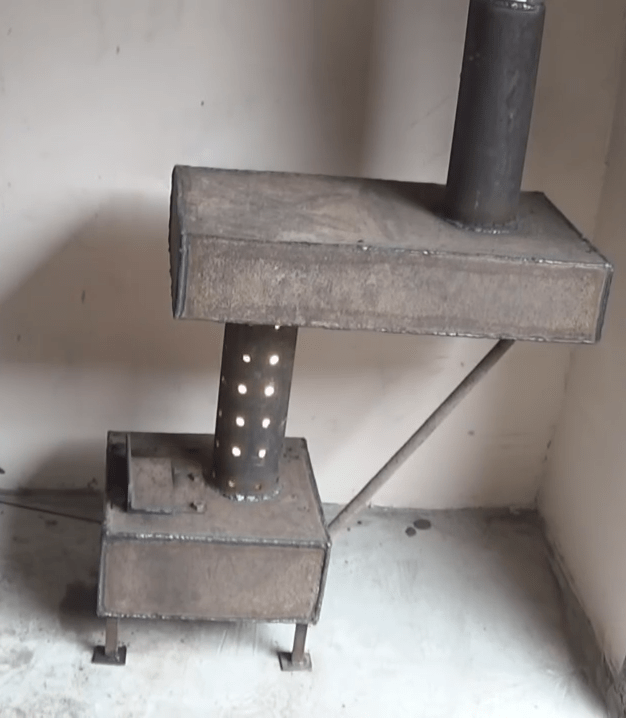 Для изготовления установки используйте толстый металл толщиной 4 мм. При креплении дымоотводной трубы к верхней стенке топочной камеры нужно усилить ее. Это место считается самым слабым, металл чаще все прогорает именно здесь.