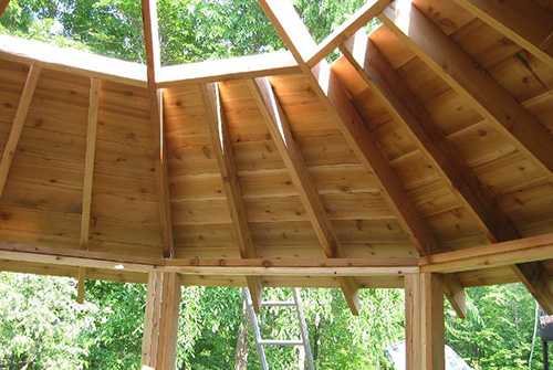 Для укрепления крыши обязательно используются поперечины. Размещать поперечины нужно в средней части каждого из скатов, формирующих крышу, которая в итоге будет иметь форму зонтика.