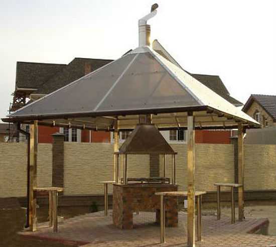 - Для вытяжки и трубы для беседки вам потребуется листовой металл. Если не хотите заниматься изготовлением трубы – приобретите готовый дымоход. Не забудьте купить к трубе оголовок для защиты от снега и дождя.
