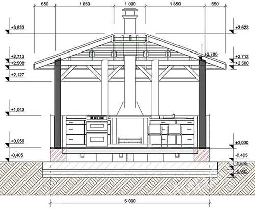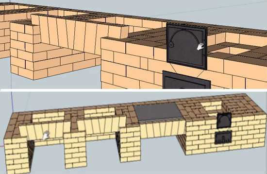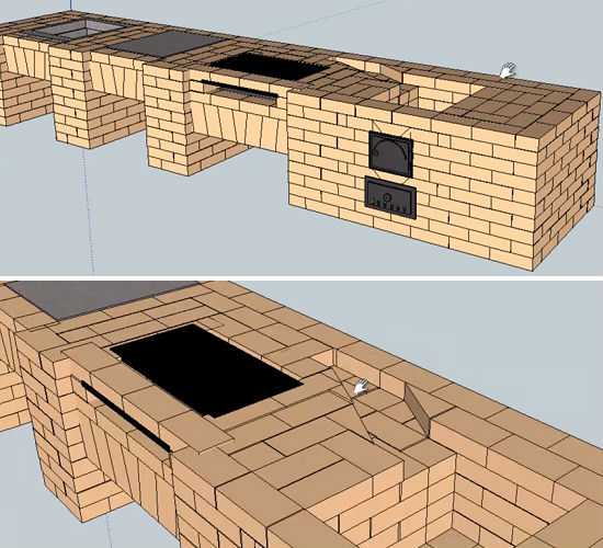 Рабочие поверхности и очаги нужно расположить так, чтобы не приходилось тянуться до них.Беседка с печкой должна включать многофункциональный очаг. Расположить духовку, жаровню и рабочую поверхность необходимо таким образом, чтобы процесс готовки был максимально удобным для пользователя. В нижней части конструкции рекомендуется установить полочки, на которых будут размещаться все вспомогательные принадлежности для приготовления пищи. Камера для готовки располагается прямо, коптильню лучше выставить в левой части. Если включить в проект заслонку, получается удобная духовка. Не стоит забывать установить в нижней части под, вмещающий достаточное количество древесины для розжига.