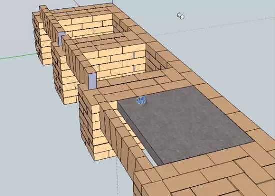 - Кладка печи для беседки из кирпича осуществляется в виде буквы «Ш». То есть, наша конструкция будет иметь две равные по размерам секции. Одна из них будет служить печью, вторая – рабочим столом.