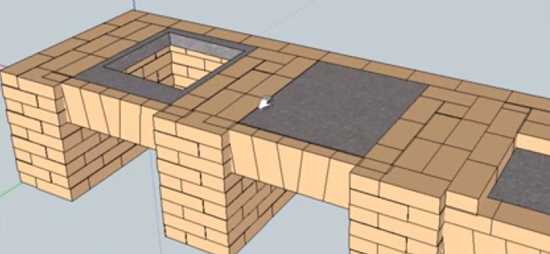 Столешницу для такой печи можно как заказать в специальной мастерской, так и сделать своими руками. Делается она очень просто: на выступающие ряды кирпича укладываем подходящие по размеру плиты, после чего штукатурим поверхность цементным раствором и отделывают сверху плиткой или декоративным камнем.