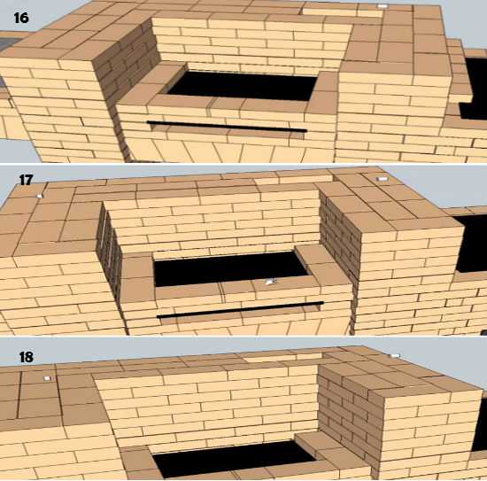 Каждый камин из кирпича включает жарочный шкаф, который выстраивается примерно 12-м по счету рядом. Чтобы было удобнее разместить шампура, рекомендуется закладывать переднюю часть конструкции одним кирпичным рядом. С 16-го ряда начинается формироваться жарочная область, на которой происходит процесс перевязки кирпичей, поэтому этот момент нуждается в контроле. Порядовка завершается образованием будущих стенок жарочной камеры. Если в печи планирую печь блюда, нужно заранее предусмотреть это и позаботиться об установке заслонки.