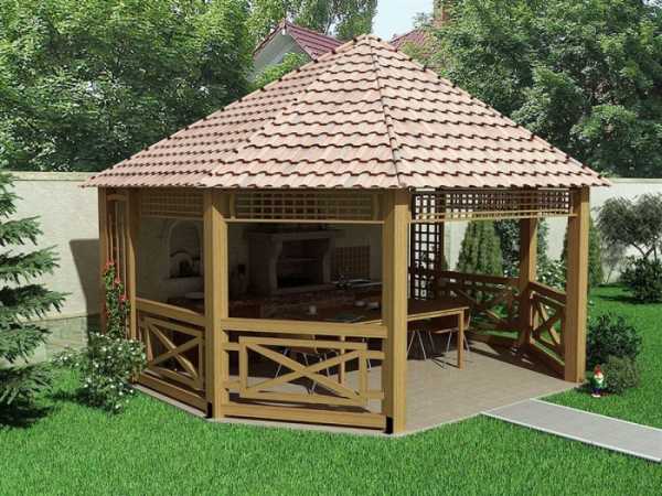 Верхнюю часть беседки можно сделать любой формы, но один из самых популярных вариантов — это шатровая кровля.