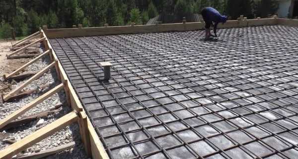 - Далее фундамент заливается на 50%, по все площади основания укладывается арматура, которая связывается специальной проволокой.