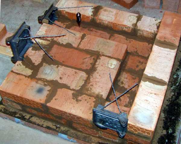 Для кладки топки нужно использовать глиняный раствор.Кладка топки продолжается по методу половины кирпича. Примерная высота устройства для сжигания составляет 10 или 12 рядов. В верхней части конструкции печки монтируются специальные металлические держатели для стержней, которые будут поддерживать мясо или другие продукты для копчения. Лучший кирпич для укладки топки — шамотный, выдерживающий максимальные температуры. Раствор для материалов лучше готовить глиняный, цементный в этом случае не актуален.