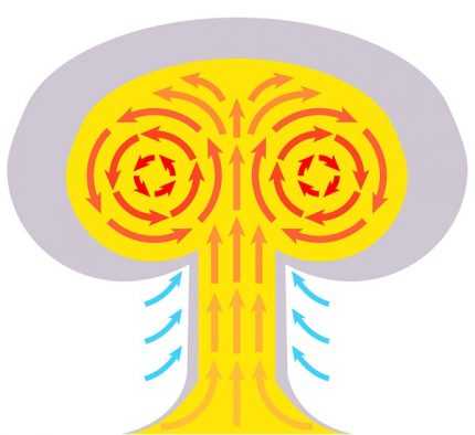 Это явление специалисты называют теплой шапкой, оно возникает благодаря естественно-ограниченной конвекции. Интенсивный поток нагретого воздуха поднимается вверх, но немного не достигает потолка, поскольку его кинетическая энергия гасится более плотными холодными слоями.