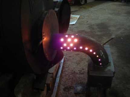 В этом элементе также проделывают отверстие для подачи воздуха, к которому потом приваривают трубу с сечением 100 мм. Она должна быть немного длиннее, чем высота корпуса печки.