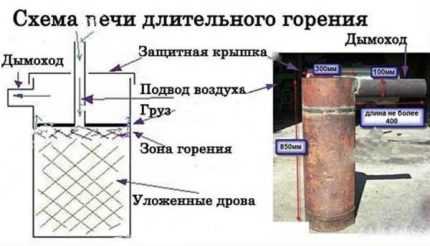 Дрова сгорают в печи длительного горения почти полностью, оставляя небольшое количество отходов, поэтому большой зольник здесь не нужен. Чтобы запустить такую печь, нужно сверху загрузить дрова, прижать их грузом, затем накрыть конструкцию крышкой, продев в соответствующее отверстие трубу для воздуха.