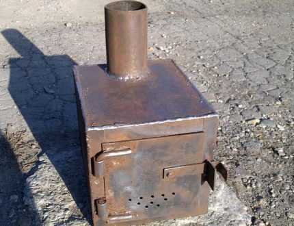 В отличие от буржуйки, такую печь делают из двух отделов, соединенных перфорированной металлической трубой.