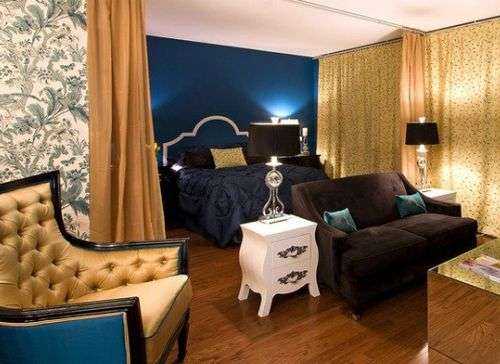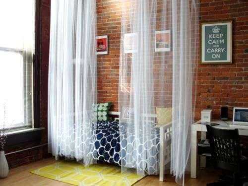 Текстиль, используемый для разделения на две зоны, придаст комнате уют и не потребует больших затрат. Для этого выбирают такие ткани как тафта или жаккард, причем плотные ткани нередко сочетают с легкими, воздушными. Чаще всего такой способ зонирования используется в спальне и местах отдыха. Чтобы гардины идеально вписались в дизайн комнаты, их ткань повторяют в подушках и покрывалах, как показано на фото.