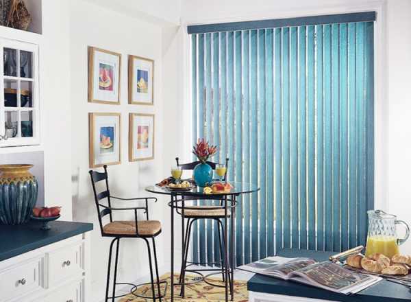 - Вертикальные представляют аналог оконных моделей с таким же расположением ламелей. Они сдвигаются вбок по направляющим.