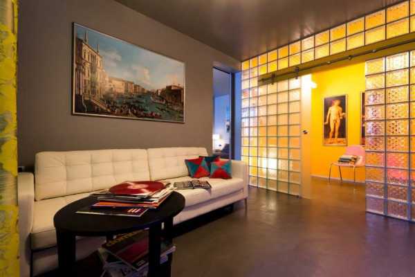 Стеклоблоки имеют хорошую теплоизоляционную способность, так как имеется воздушная прослойка между двумя стеклянными стенками. Из них, как из кирпичей, кладется стенка, но при этом не обязательна укладка вразбежку, может быть и шов в шов. Стеклянные перегородки в квартире из стеклоблоков пропускают свет, но не являются прозрачными. Это неплохой вариант, если необходимо отгородить, например, ванну от остального помещения, поставить перегородку в длинной комнате.