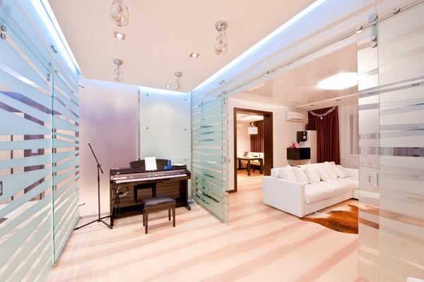 Удобный вариант раздвижных межкомнатных перегородок из матового стекла