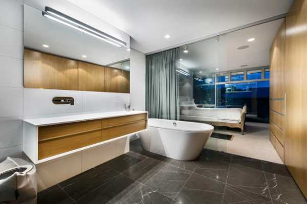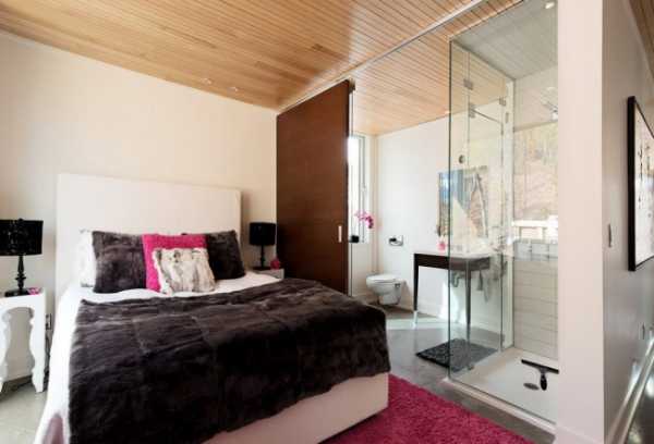 Современный интерьер спальни со стеклянной перегородкой в ванную комнату