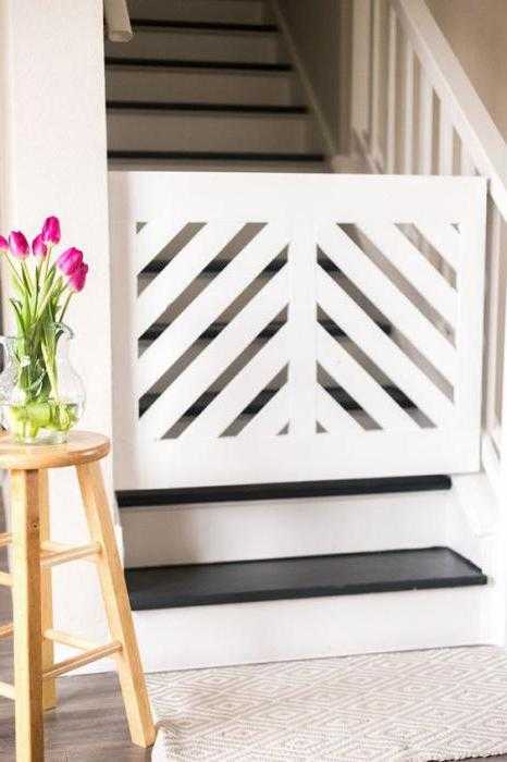 Если по какой-то причине у вас не получается приобрести материалы и сконструировать защиту для лестницы своими руками из специализированных материалов, можете использовать подручные средства. Зачастую для таких целей используются присутствующие в доме конструкции. К таким относят спинки детских кроватей с вертикальными прутьями или пластмассовые решетки. Такие препятствия устанавливаются встык. Единственное, о чем необходимо позаботиться – это ширина прохода, который требуется оградить. Перегородка должна полностью вписаться по ширине в замеренное пространство и надежно «сидеть» в нем. Естественно, это временное решение, с перспективой замены на более надежную конструкцию.