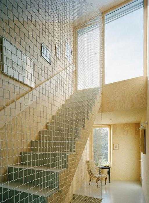 Сетку используют в тех случаях, если установить пластиковую защиту на лестницу нет возможности или желания, а перила не отвечают требованиям безопасности для детей. Сетка, специальным способом натянутая, может заменить недостающие балясины в конструкции перил или пластиковое ограждение (если будет выполнена по типу гамака), а то и полностью перекроет лестничный пролет от ступеней до потолка, полностью исключая падение. Такие веревочные конструкции могут быть выполнены в любом цвете.