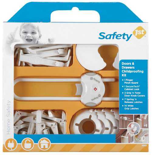 В специализированных магазинах продаются специальные наборы для безопасности детей дома, в которые включены комплекты из заглушек для розеток, защиты для ящиков, дверей, замки для холодильника, унитаза, а также накладки на углы.
