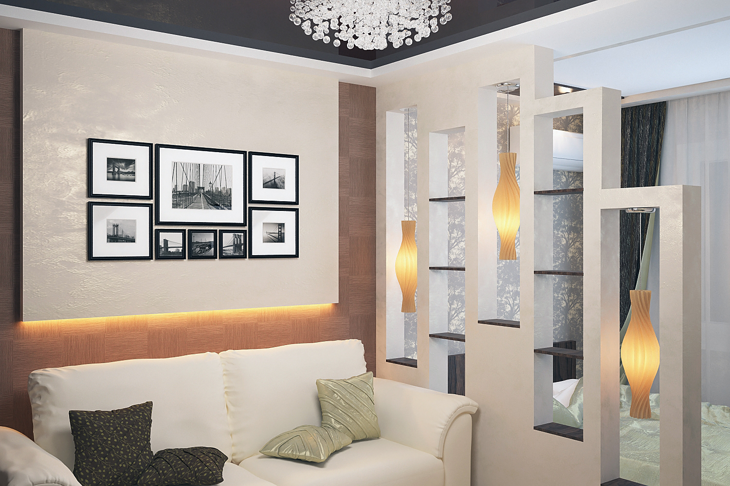 - Зонирование прямоугольной комнаты на спальню и гостиную