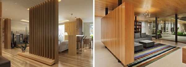 Но деревянные переборки не только имеют функциональное предназначение, но и помогают создать интересную обстановку в жилом помещении. Оригинальные идеи дизайнеров можно воплотить у себя дома.