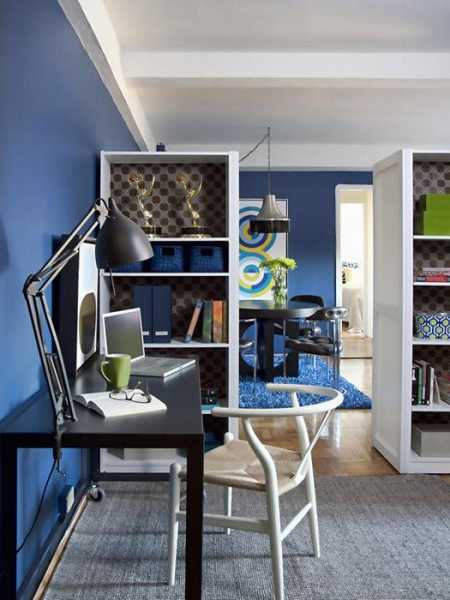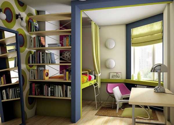 Интересное решение в интерьере с обозначением рабочей зоны и спальни при помощи книжного шкафа