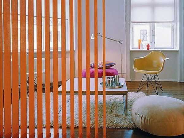 - Перегородка-жалюзи. Преимущества: пропускает свет, форма и цвета – на вас вкус, лучший выбор для маленькой комнаты. Минус: пропускает и посторонние звуки, полное отсутствие звукоизоляции;