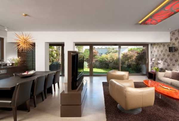 Сдвинув деревянные перегородки, можно получить роскошную и просторную гостиную комнату, которая по-настоящему впечатлит гостей.
