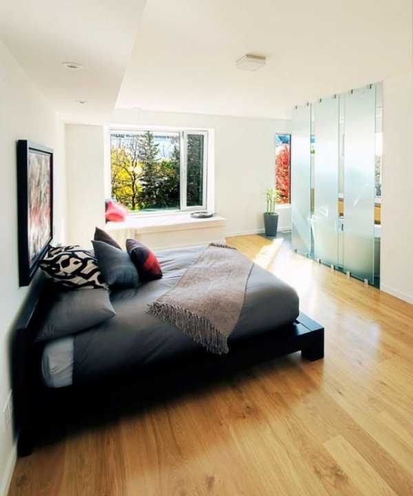 Нестандартное решение – объединение спальни с ванной комнатой. Такой вариант позволит принимать ванну при нежном дневном свете. Общий вид интерьера отличается воздушностью и легкостью.