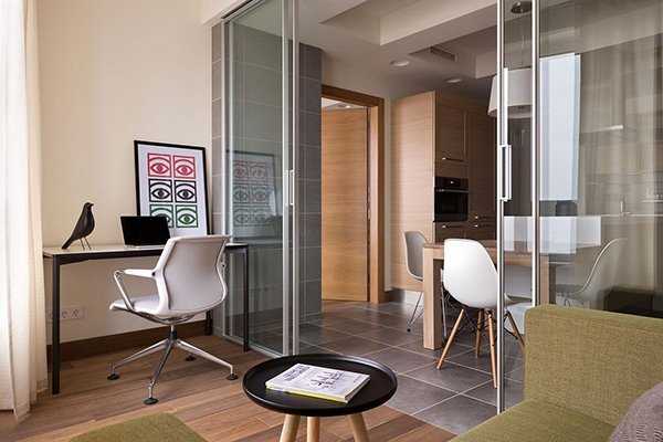 Цельностеклянные перегородки можно установить в квартире на кухне, для того чтобы отделить обеденную зону от рабочей. Сдвижные конструкции рекомендуется поставить в просторной комнате, они позволят разделить ее на две части.