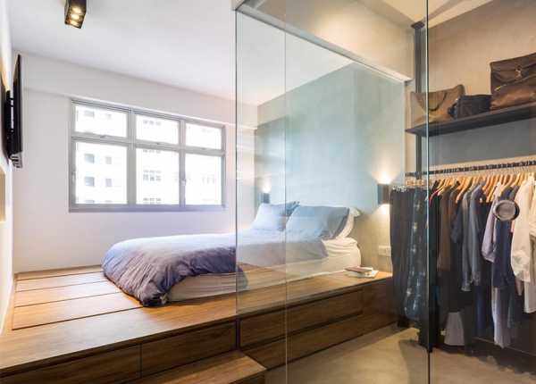Симбиоз отдельно установленных стеклянных перегородок и шкафов: подвижные стеклянные панели с потолочным креплением направляющих по сути являются дверями для встроенных в стену ячеек для хранения вещей. Неплохое решение для глухой торцевой стенки.