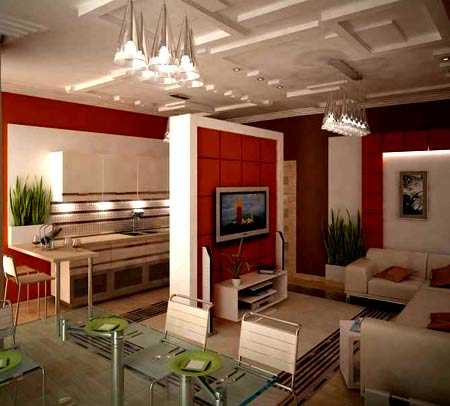 Такого рода зонирование гостиной является актуальным и для маленького дома, в котором живет большая дружная семья. В том случае, когда кухня объединена с гостиной, необходимо обязательно провести зонирование гостиной, чтобы разделить помещение на зоны. В одной будут принимать пищу, в другой отдыхать.