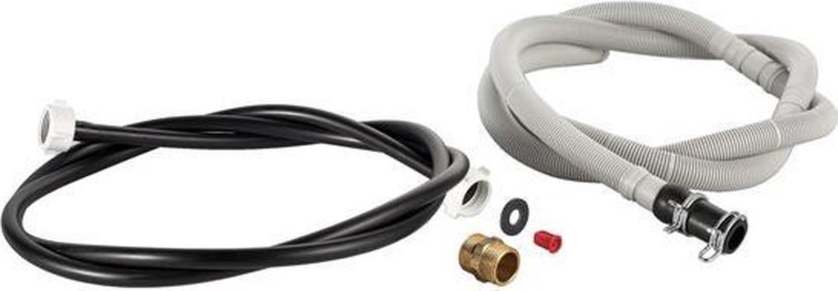 В комплект входят: 1 сливной шланг для стиральной машины, 1 соединитель для сливного шланга, 2 хомута для шланга.