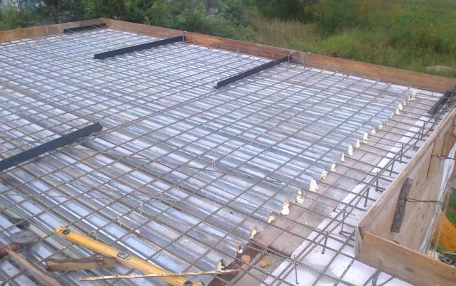 Такое перекрытие состоит из монолитной плиты, которая изготавливается на месте и опирается на стены. Для изготовления используют арматурную сетку и бетон.